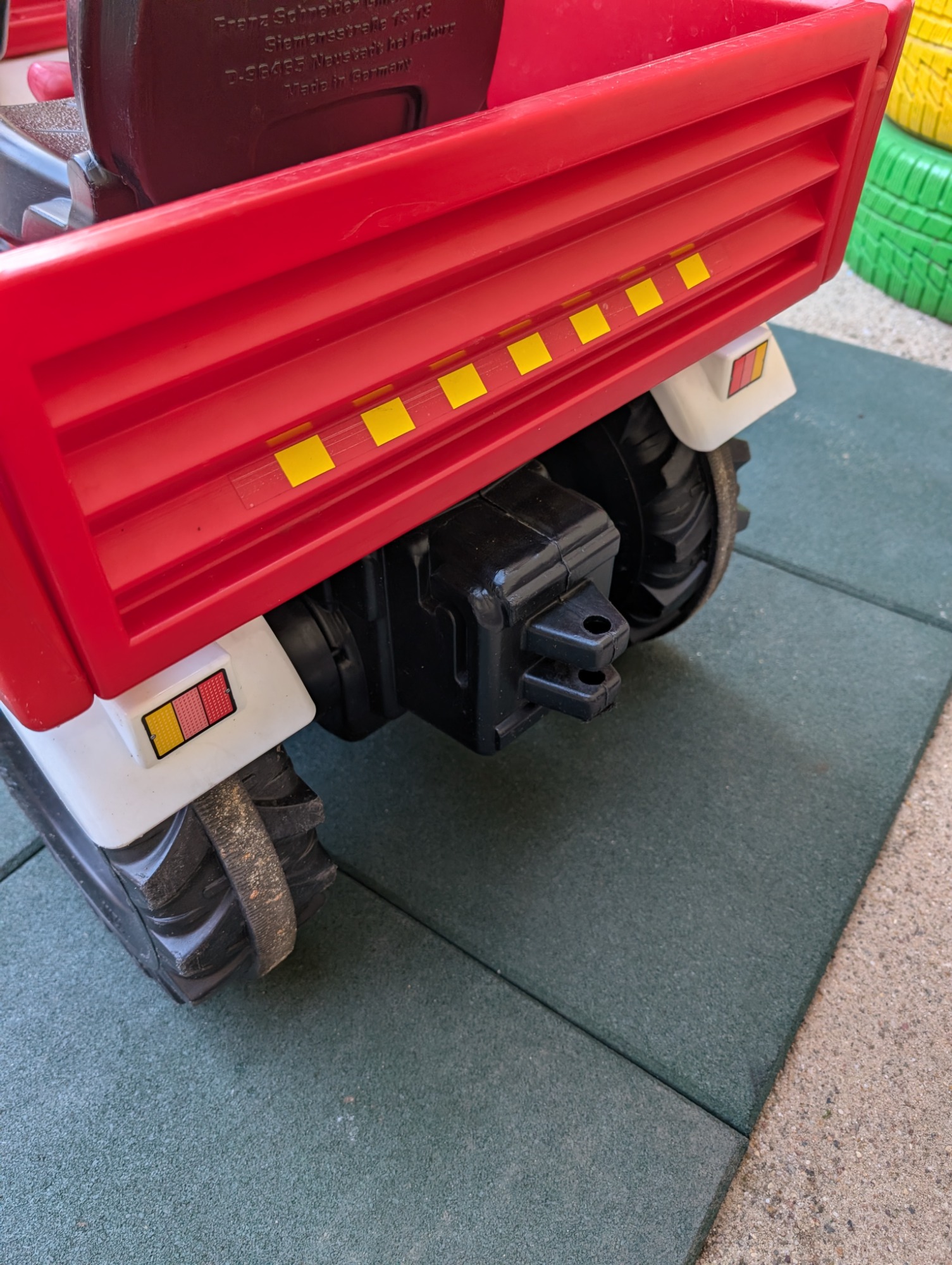 Optisch sichtbare Kratzspuren, Lackkratzer, Aufkleber teilweise zerkratzt, sichtbare Wetterbedingte Verfärbung, was aber den Spieltrieb und die Funktion nicht beeinträchtigt.